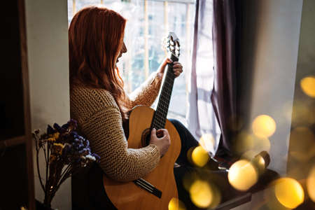 Unaltered candid portrait of young red haired woman in sweater playing acoustic guitar sitting by window at home. Hobbies, indoor home activities for adults in winter, autumn.