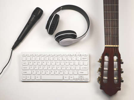 Top view or flat lay of computer keyboard, headphones, microphone and acoustic guitar on white background. Online music lessons or musician concept.
