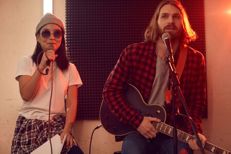 Portrait of contemporary music band playing guitar and singing to microphone during rehearsal or concert in dimly lit studio