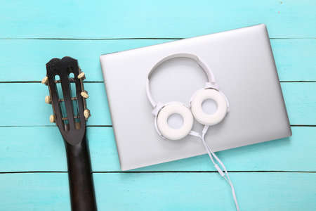 Acoustic guitar neck and laptop with headphones on blue wooden background. Online guitar lessons. musical concept. top view. flat lay