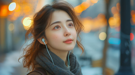 This photo has intentionally used the grain of 35mm film to convey the sense of an Asian business woman looking sideways while waiting for a cab in the morning. A young woman with earphones enjoying