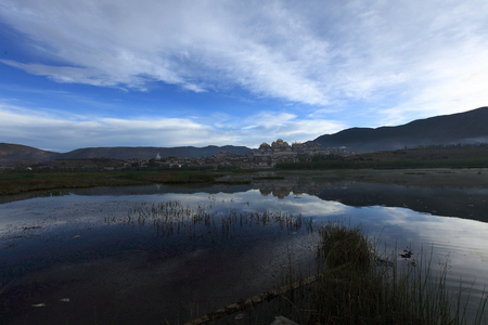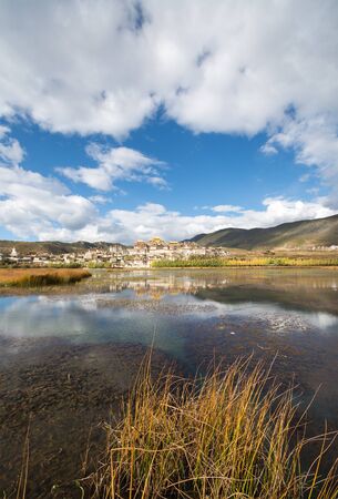 The lake in front of Songzanlin Monastery background at Shangri-la, China