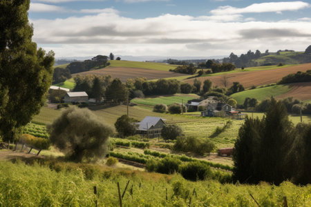 view of rolling hills with farmhouses and crops in the distance, created with generative ai