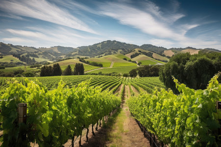 lush vineyard with rolling hills and scenic mountain range in the background, created with generative ai
