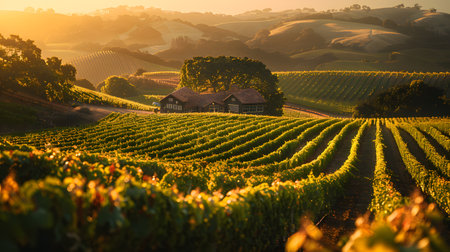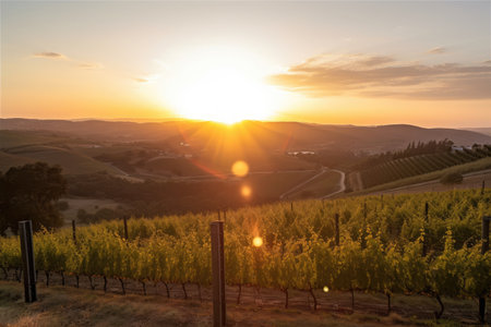 vineyard view from hilltop, with golden sun setting behind the vineyards, created with generative ai