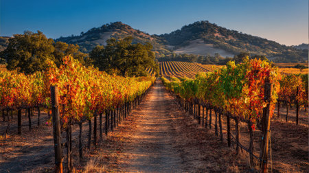 Warm sunlight bathes rows of grapevines in a vineyard, creating a picturesque autumn scene