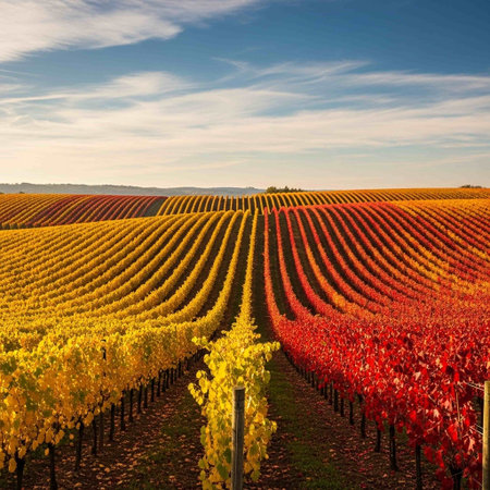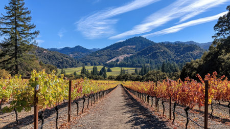 A beautiful autumn landscape featuring rows of colorful grapevines leading through a peaceful vineyard with distant mountains under a bright blue sky.