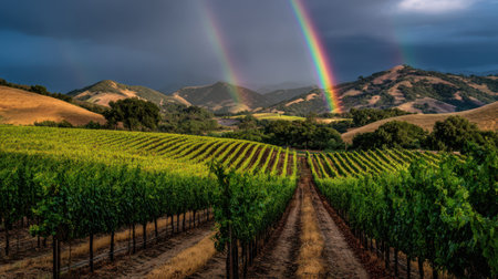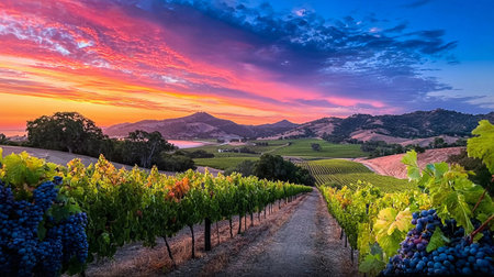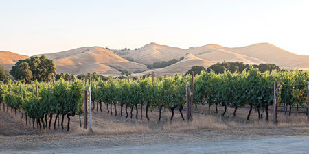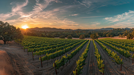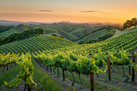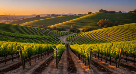 Vibrant sunset over a vineyard in California showcasing lush grapevines and serene hills during early evening hours