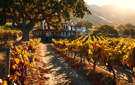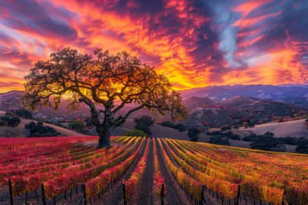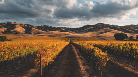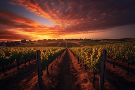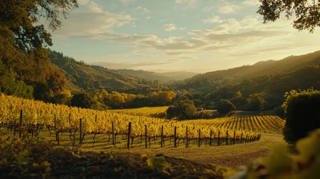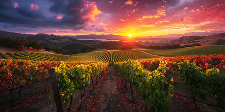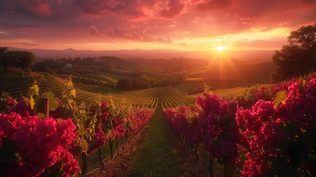 A stunning sunset captures the beauty of a vineyard landscape during autumn. Golden foliage, rolling hills, and a peaceful atmosphere create a tranquil scene.