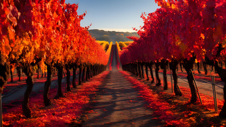 Vibrant autumn tones illuminate a vineyard pathway, flanked by yellow and orange foliage. the scene showcases a serene forest ambiance, with gently curving trees framing the lush vineyard corridor. Generative AI