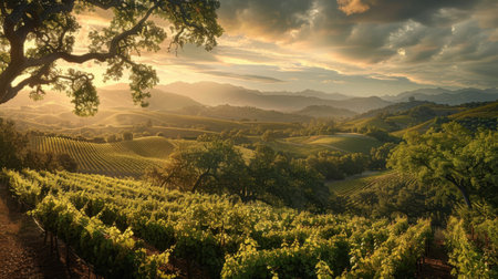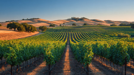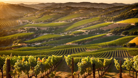 Rows of grapevines bask in the warm, sunlit glow of dusk, surrounded by a serene landscape of hills and valleys in the wine country.