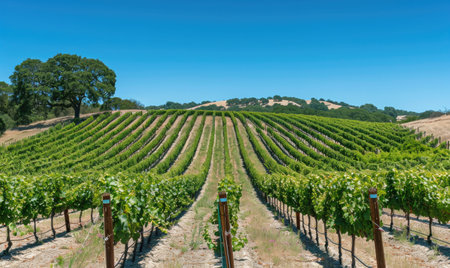 Beautiful vineyard landscape with neat rows of grapevines under clear morning sky