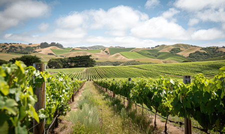 Explore the beauty of a scenic vineyard landscape featuring lush green grapevines set against rolling hills under a vibrant sky. Perfect for nature lovers!