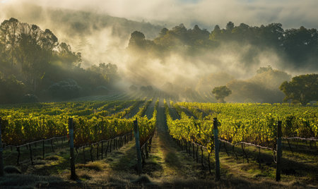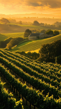 Golden sunlight spills over a tranquil vineyard in the morning, illuminating lush grapevines under a misty sky. The serene landscape invites peace and reflection.