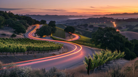 Amidst the rolling hills and vineyards a lone car travels along the curving roads leaving a trail of vibrant headlights and capturing the essence of the scenic drive