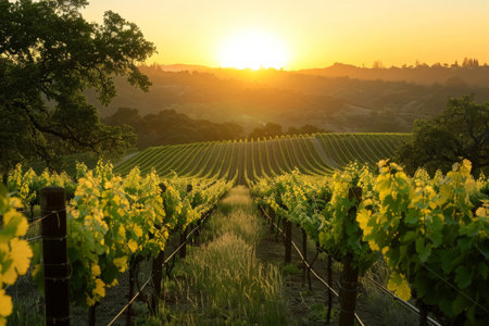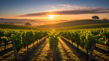 Rows of lush grapevines stretch toward a stunning golden sunset in a tranquil vineyard setting. Rolling hills create a serene backdrop, enhancing the natural beauty of the landscape.