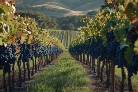 A lush vineyard with ripe grapes hanging from vines, showcasing rolling hills in background