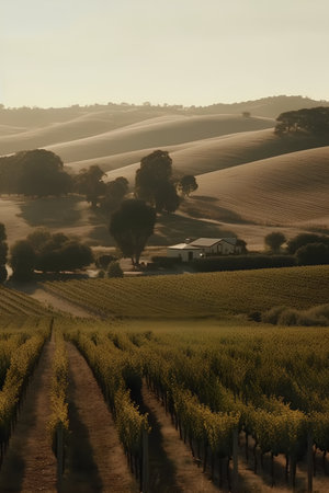 Rustic Vineyard Stretching Across Rolling Hills, Perfect For Wine Themes Wine Themed Rustic Vineyard, Winemaking In A Rustic Vineyard.