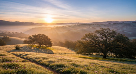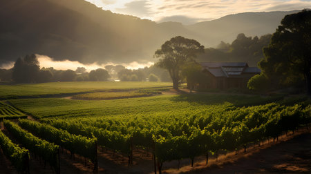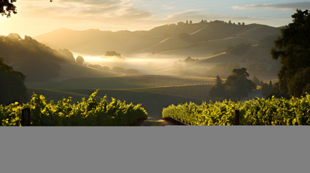 A serene dawn view of a vineyard with lush rows stretching towards rolling hills, enveloped in morning mist and soft light, showcasing peaceful countryside charm.