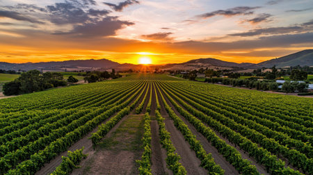 A stunning sunset illuminates lush vineyard rows, showcasing the beauty of agriculture against rolling hills and a vibrant sky, creating a serene landscape.