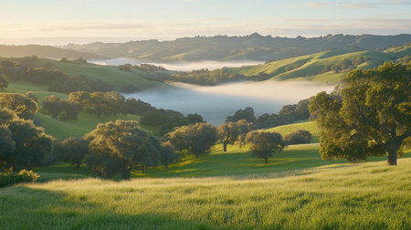 A misty morning landscape, with soft fog rolling over rolling hills and a soft golden light filtering through the atmosphere.