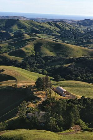 Soft morning light washes over lush, vibrant green hills, highlighting the gentle contours and tranquil scenery.