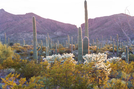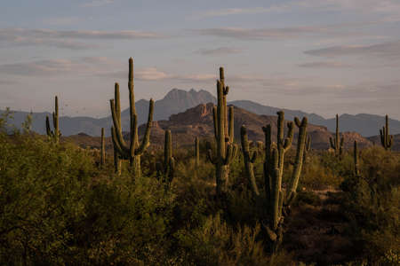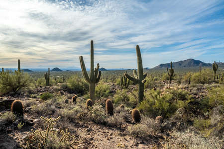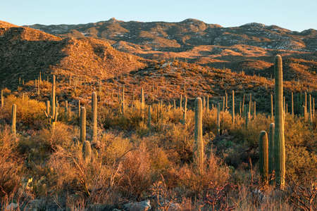 Desert landscape in late afternoon sunlight in Saguaro National Park East District, Arizona