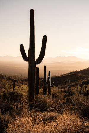 A beautiful shot of the Saguaro National Park in Arizona on a sunset background