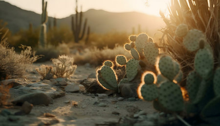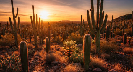 A beautiful desert landscape with tall cactus plants silhouetted against a golden sunset, creating a sense of peace and tranquility.