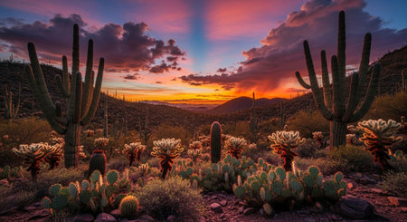 A stunning sunset illuminates a desert landscape with towering cacti silhouetted against the fiery sky.