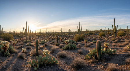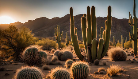 A scenic view of cacti in the desert at sunset. The sun is setting behind the mountains, casting a golden glow on the landscape.