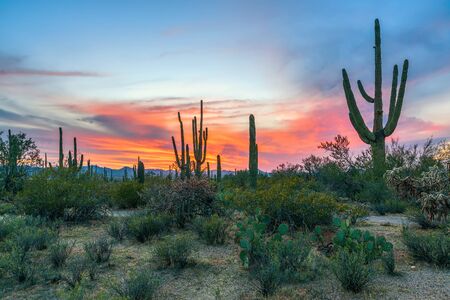 Sunset in Saguaro National Park with Saguaros in the foreground. Arizona. USA