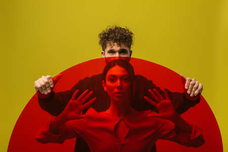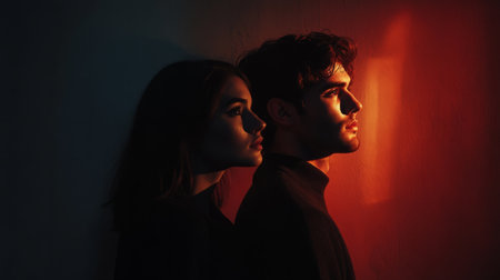 A captivating silhouette of a young man poses against a vibrant red backdrop filled with sparkling lights, creating a magical and artistic ambiance.