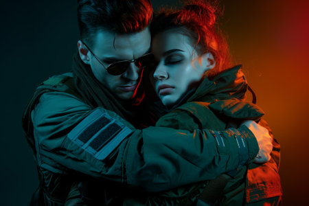 Two soldiers, a man and a woman hugging while wearing military on a dark background.