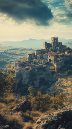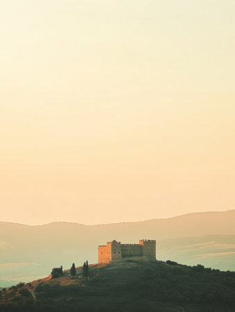 An ancient castle perches on a hilltop bathed in warm sunlight, offering tranquility and a panoramic view. Perfect backdrop for any project.