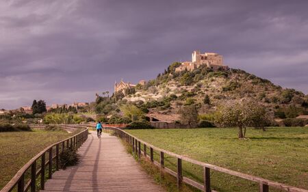Parish church and Pilgrimage church of Sant Salvador Arta, located on a hill with fields and a wooden walkway in the foreground, daytime with dark dramatic clouds and a cyclist, Mallorca, Spain.