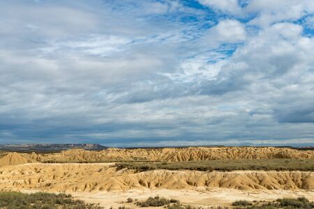 Sedimentary eroded hills on the white ground of the Spanish semi-desert Bardenas Reales