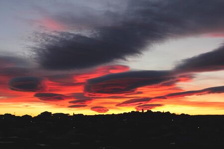 Beautiful sunset with red ribbon clouds like roses. Red-blue sunset over the city with dark clouds. Dark silhouette of the city with a beautiful dawn. Artistically blurry.