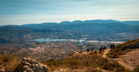 A stunning view of the Beniarres reservoir in Spain, with a blue lake and tourists admiring the nature