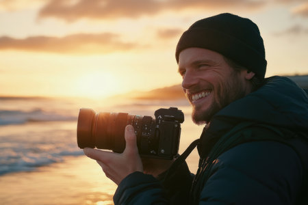 A beginner photographer enjoys the art of capturing a vibrant sunset, holding a camera and focusing on a beautiful landscape. The colors create a stunning backdrop for creativity.