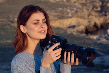 cheerful woman photographer outdoors rocky mountains professional work tourism