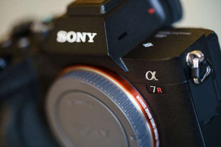 Melbourne, Australia - Feb 10, 2016: Close-up view of the logo on Sony A7R II mirrorless camera. The camera features the world's first 35mm backside illumination CMOS sensor.