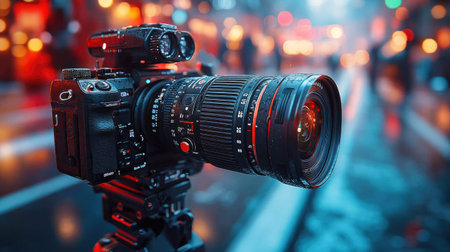 Close-up of a professional video camera capturing a vibrant street scene with bokeh lights in the background, emphasizing the focus on equipment and cinematic style.