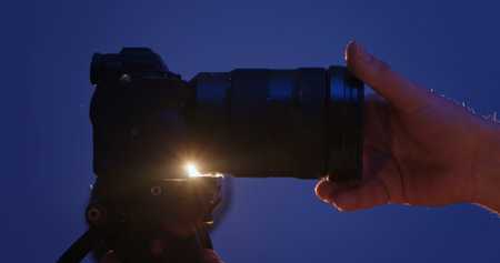 Close up of a professional DSLR camera with a lens on a blue background, showcasing intricate details. The operator hand attaches the lens to the camera. Backstage photo shoot.