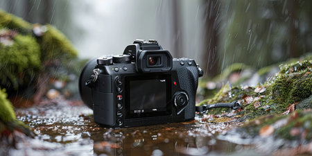 A stunning professional camera rests on a wet surface, surrounded by dramatic lighting and shadows, creating an artistic atmosphere perfect for photography lovers.