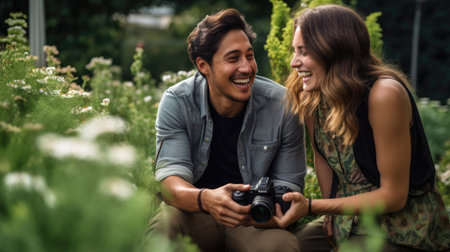 A photographer and model sharing a quiet laugh while planning a photoshoot.