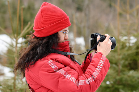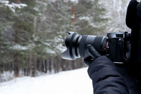 Winter photography. In the foreground on the right is a cut-off image of a man with a professional camera in his hand, with snow-covered trees in the background. Copy space.
