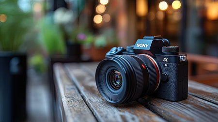 Sony alpha 7r v camera with a large lens resting on a wooden table, with a blurred background