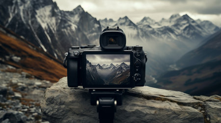 a camera perched on a rock captures the majestic mountains in the background. this photo showcases a multi-layered composition, reminiscent of the swiss style. with back button focus and varied brushwork techniques, this high-quality photo by thomas wrede is a stunning visual experience. the 8k resolution adds to the overall detail and clarity of the image. ai generated