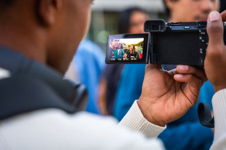 Young person holding a digital camera, filming three diverse students smiling and engaging in conversation on a university campus, capturing modern education and youth content creation
